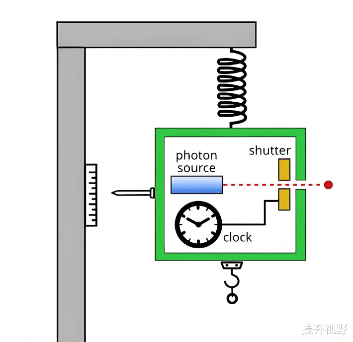 浅薄说:有一个挂在弹簧秤上的盒子,内部装着光子。盒子上有个快门,由时钟截止。快门短暂开启一下,放出一个光子。