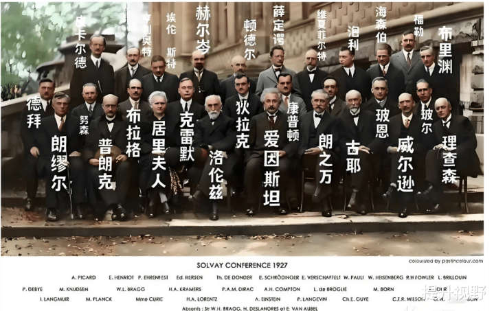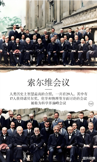 一张大合影,配景是一栋旧式建筑。前排正中间坐着爱因斯坦,一脸谨慎,居里夫东谈主也坐在前排。背面站着一大堆穿戴深色西装的男东谈主。