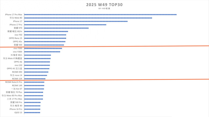 关于2025年W49(12.1-12.6)国内手机畅销榜,亓纪的思法是这么的:在单品销量方面,苹果在收货和握久度方面王人是王者,最近接近3个月的畅销榜即是最佳的笔据。至于在高端智高手机方面,以本周的畅销榜数据为例的话,苹果和华为各占一个梯队,然后才是其他的国内主流厂商,其中最惊喜的应该是小米17Pro Max。